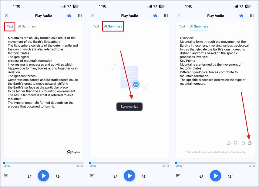 Passez dans le panneau “AI Résumé” puis appuyez sur “Synthétiser” pour afficher le résultat sur l’interface suivante. Une fois frais, utilisez le bouton “Copier” en bas à droite.